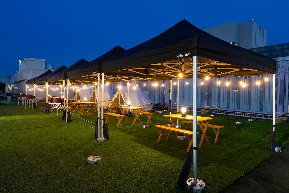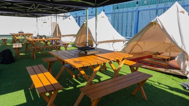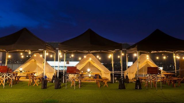 The rooftop garden has 12 glamping tents with BBQ equipment that can accommodate up to 96 people.