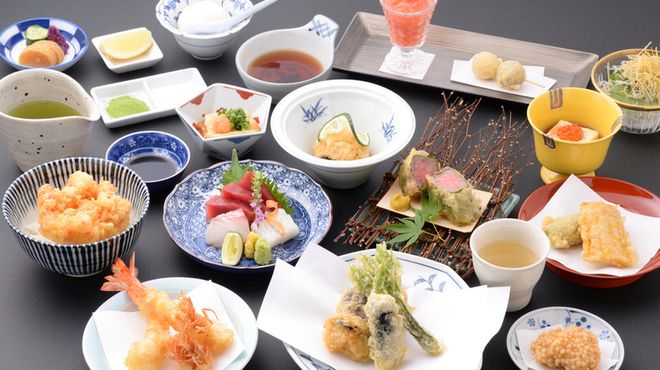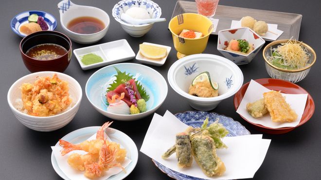 Appetizer (Kyoto specialties) 13 types of tempura assortment: Namba, shrimp bread, 2 kuruma prawns, sea bream wrapped in shiso, Kyoto namafu, sesame tofu river fish, 4 seasonal vegetables, peony conger eel Palate cleanser (Endo special salad) Meal (tencha tea, tempura bowl, tempura bara or rice and kakiage) (red miso soup, 3 types of pickles) Dessert (seasonal sorbet) *Contents may vary depending on the season and availability.