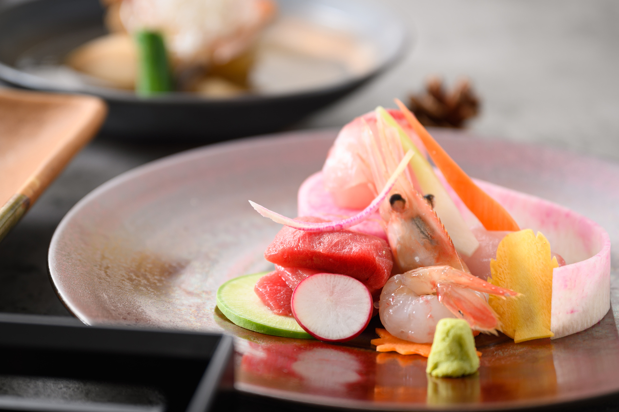 特別な夜の始まりはクリスマスカラーをあしらった鮮やかな前菜から。続くお造りも華やかに聖夜を彩ります。