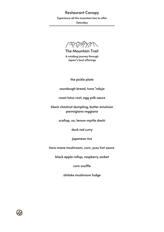 Menu Selection: The nine-course Mountain Trail menu is not available on Monday - Pizza Night offers a fixed five-course menu.