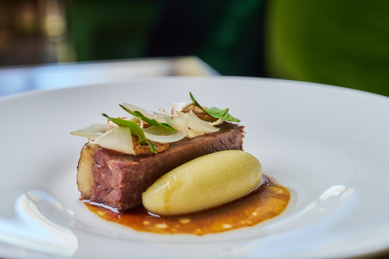 Yamagata pork loin, aubergine, chrysanthemum leaf