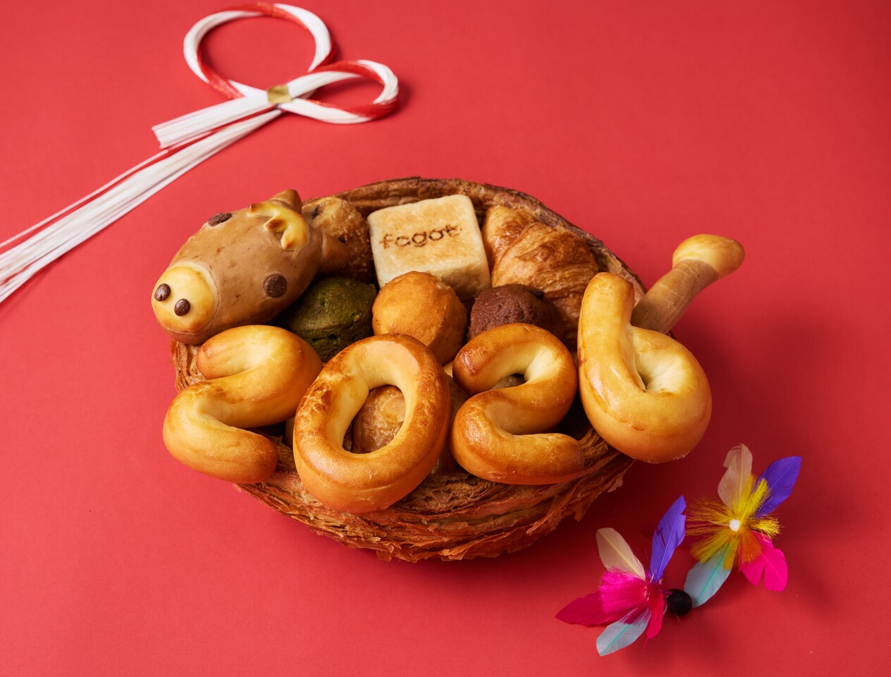 新年を祝う特別な一品、ファゴットオリジナルのデニッシュバスケット。サクサクと香ばしいデニッシュで作られた食べられるかごの中には、2026年の形に焼き上げたミルクパン、干支モチーフのパンががお正月の食卓を華やかに彩ります。そのほかキューブ食パン、クロワッサンなどを詰め合わせました。