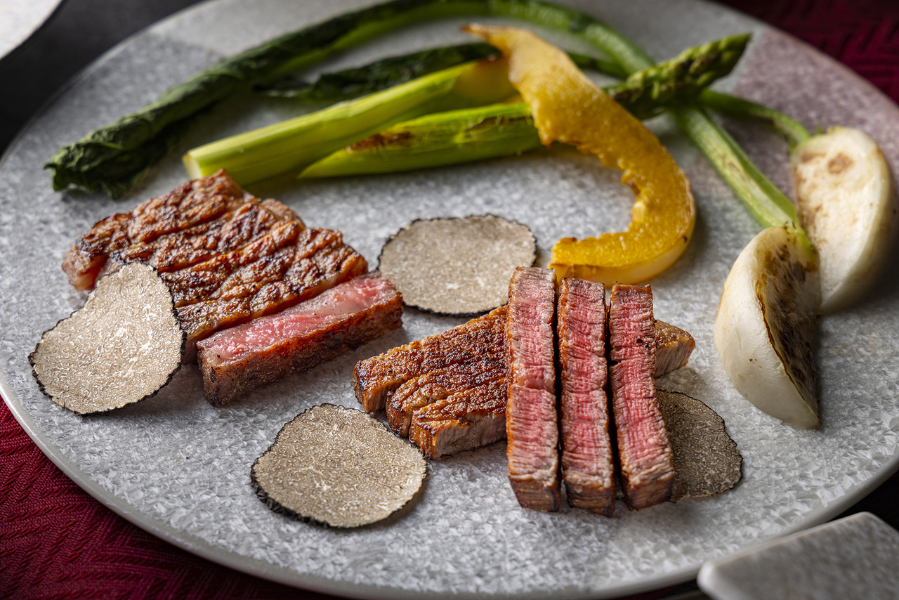 For the main course, indulge in a comparative tasting of Akigawa sirloin from Tokyo and tenderloin of Yokohama beef, accompanied by winter vegetables and the fragrance of truffle.