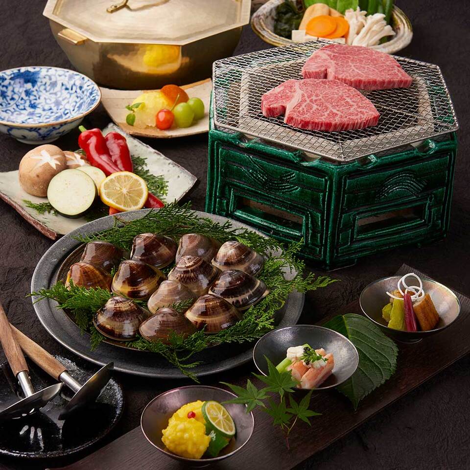 ●先附 ●前菜 ●旬菜 ●季節の逸品(大はまぐり炭火焼としゃぶしゃぶ) ●炭火あみ焼(シャトーブリアン) ●すき焼又はしゃぶしゃぶ ●季節野莱 ●選べるお食事 ●デザート