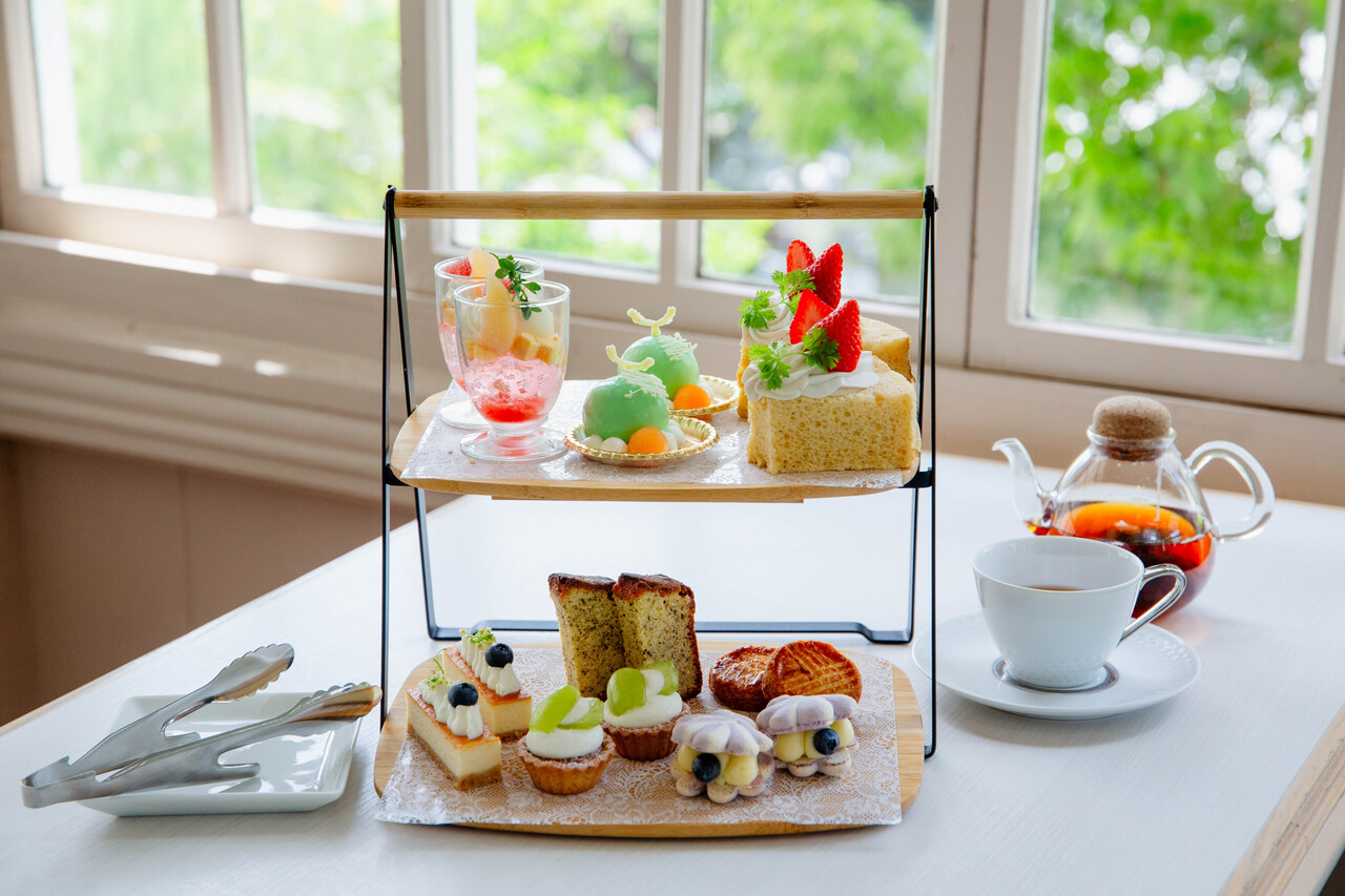 The menu for July to September is a lineup of summery treats, including a mini peach parfait, a two-layered mousse overflowing with melon juice, a tart topped with Shine Muscat grapes, and a galette bretonne made with Awaji seaweed salt.