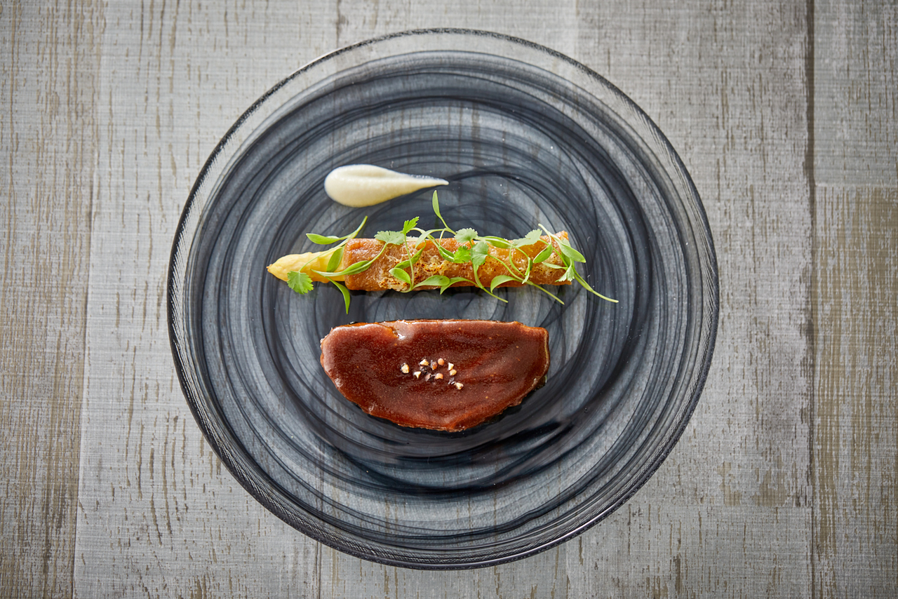 Chef Sakayama has devised a menu to coincide with the Hakozaki Shrine Hydrangea Festival, which will be held at the flower garden from June 1st. The course menu expresses the unique worldview of the fusion of Japanese gardens and French cuisine that can only be experienced at La Saison. A total of eight dishes including amuse bouche, appetizer, rice, fish, palate cleanser, meat, dessert, and petit fours.