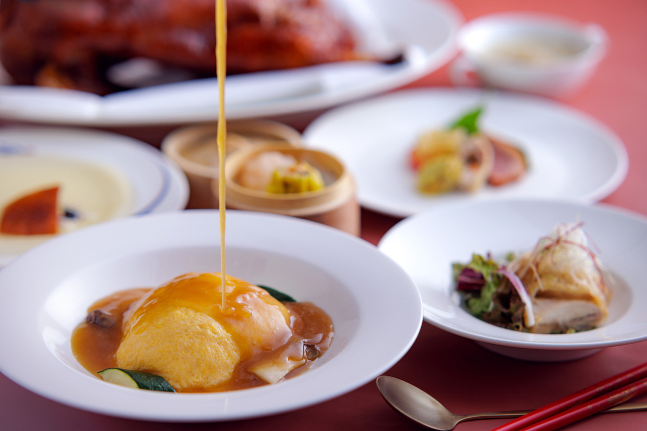 特別前菜盛合せ / ふかひれ入りそら豆のスープ / 海老のチリソース おこげを添えて / 北京ダック / 点心2種 / 土鍋ふかひれあんかけご飯