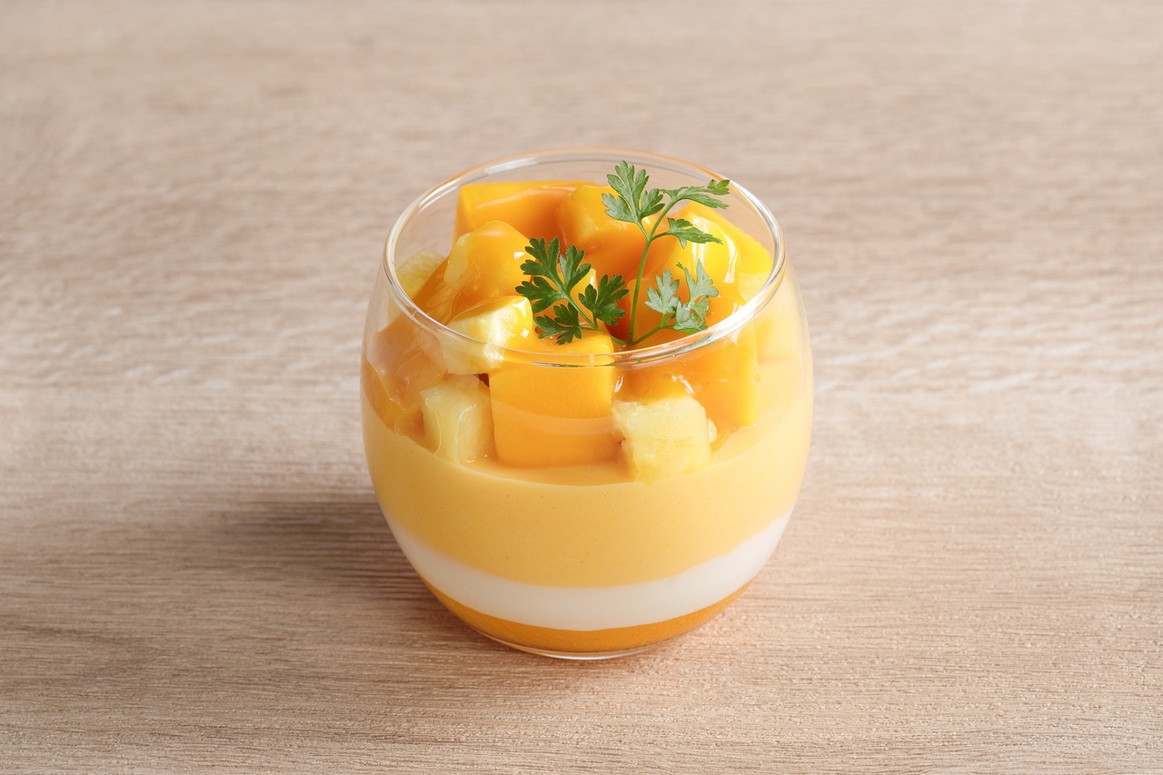 マンゴージュレ、ココナッツムース、マンゴームースを3層に重ね、マンゴーとパイナップルを飾り、パッションフルーツのソースを流しました。マンゴーの濃厚な甘みとココナッツの甘い香りにアクセントとしてパッションフルーツの爽やかな酸味を加えた、トロピカルな味わいのグラスデザートです。