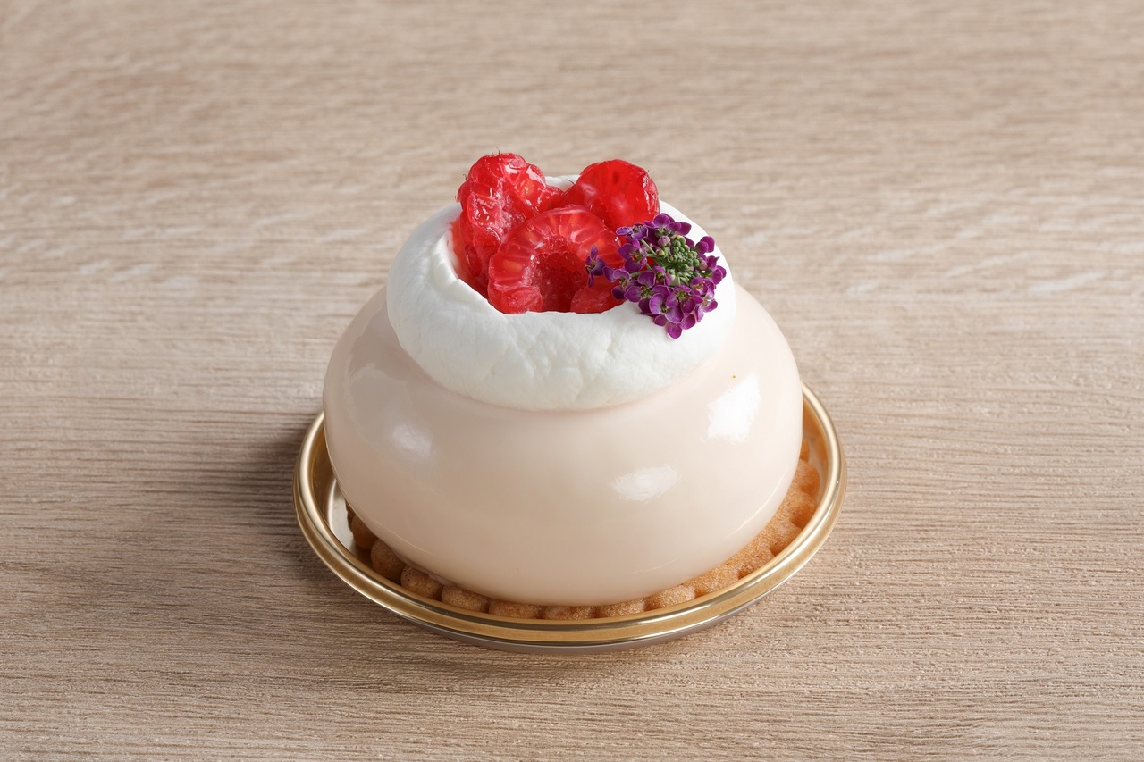 チョコレートムースとラズベリーのジュレをトンカ豆のムースで包み込んだ、可憐なパステルピンクのムースケーキ。バニラに桜やスパイスを加えたような豊かな香味のトンカ豆とほろ苦いチョコレート、甘酸っぱいベリーのマリアージュをお楽しみください。