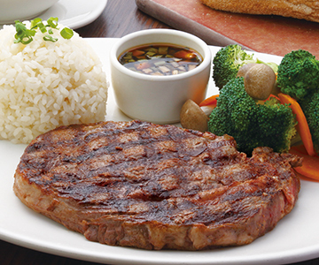 A marbled premium Aussie Angus ribeye steak, lightly seasoned and flame grilled. Served with butter rice, fresh veggies and Caesar salad.