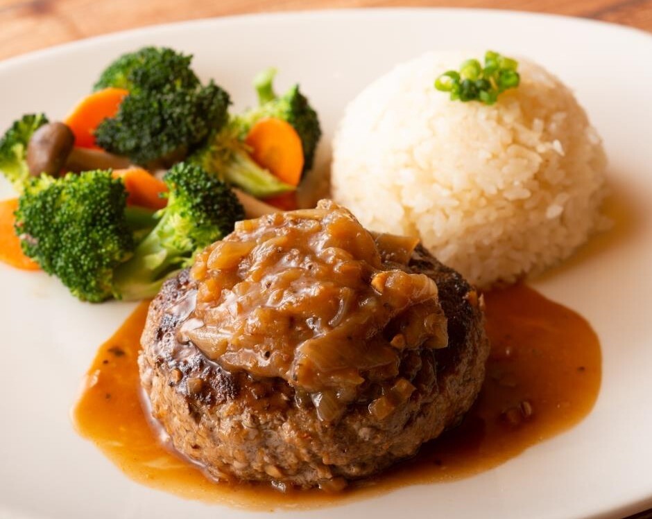 Mouth watering hamburger steak topped with caramelized onions and demiglace sauce. Served with butter rice and fresh veggies.