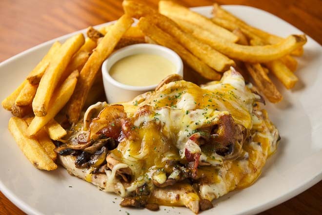 Grilled chicken breast topped with sautéed mushrooms, crisp strips of bacon, melted Steppen and Cheddar and finished with our honey mustard sauce. Served with Aussie Fries.