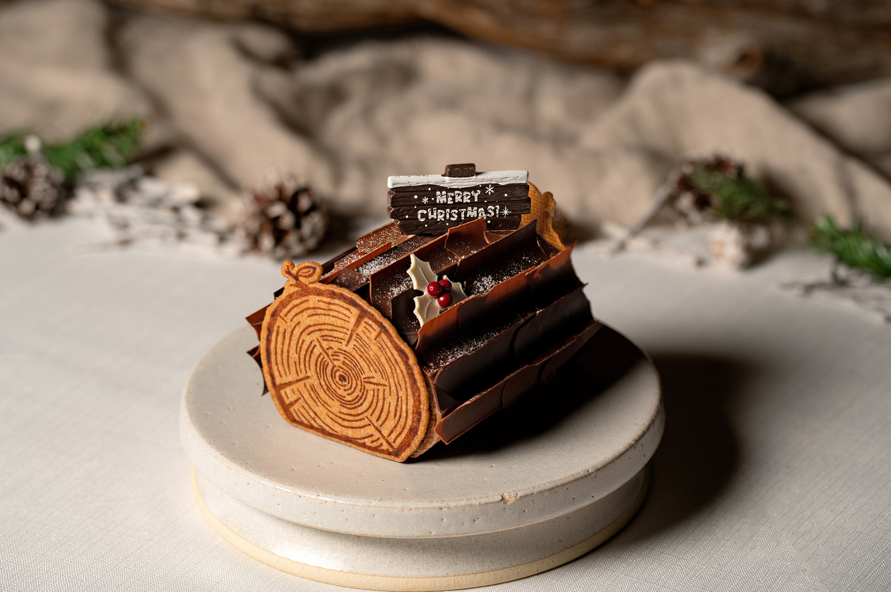A roll cake inspired by a tree stump, generously filled with rich and silky