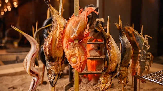 名物原子焼きで焼き上げるキンキ、一期一会で仕入れたその日の食材をふんだんに使ったコースです。