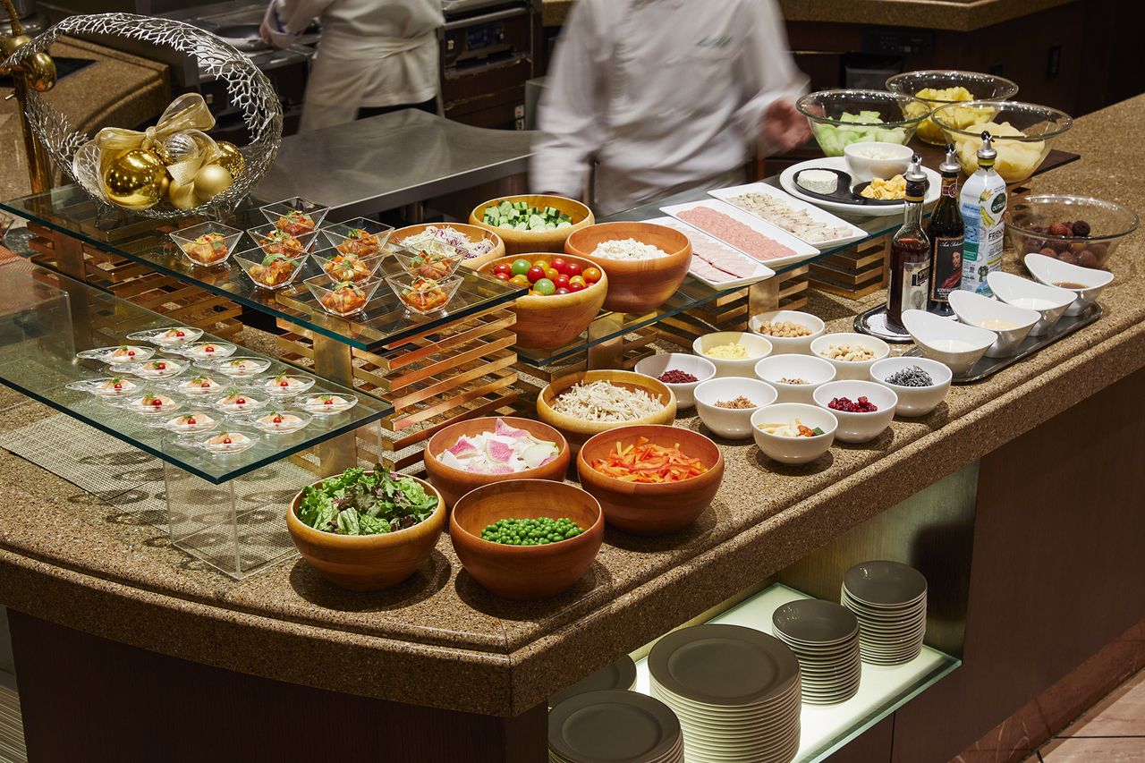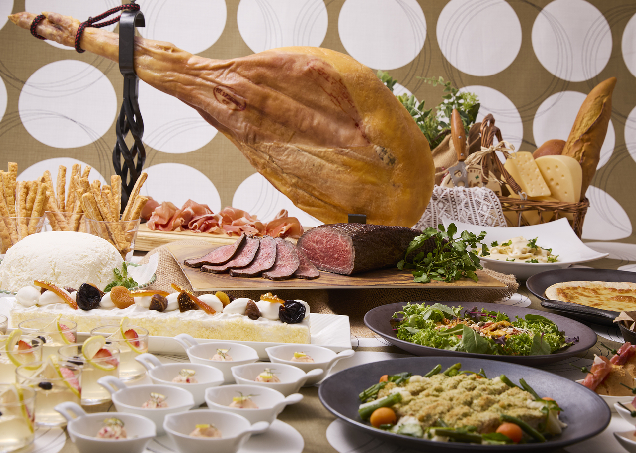 お客様の目の前で原木からカービングする熟成した生ハムと、チーズのマリアージュがお楽しみいただけるブッフェ
