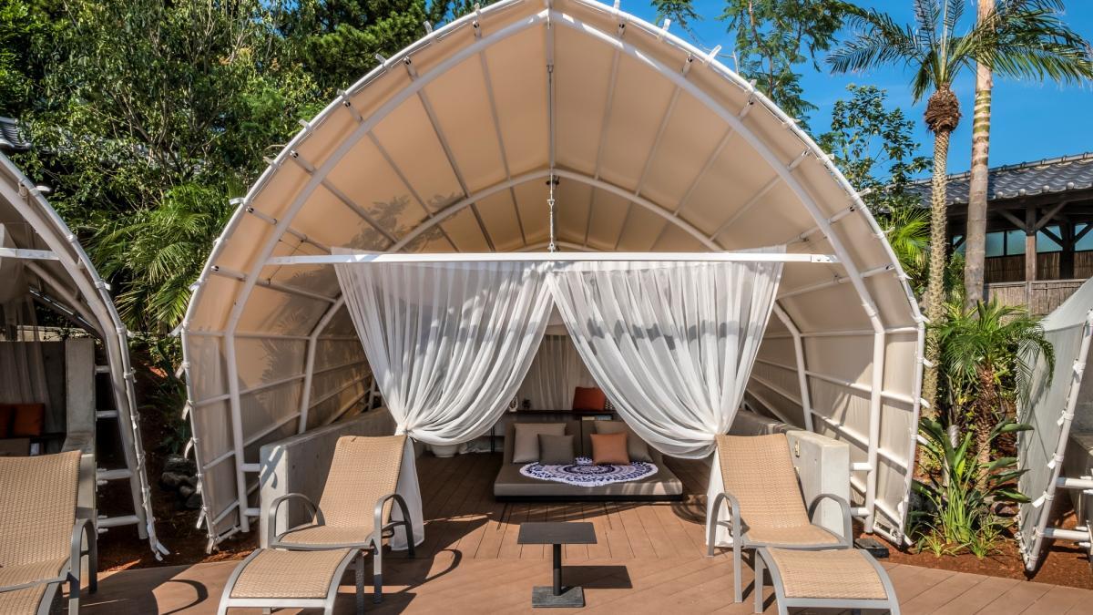 大きめのデイベッドがある「水辺のガゼボ」からは、南国リゾートを思わせる多彩な植物やプールを臨めます。