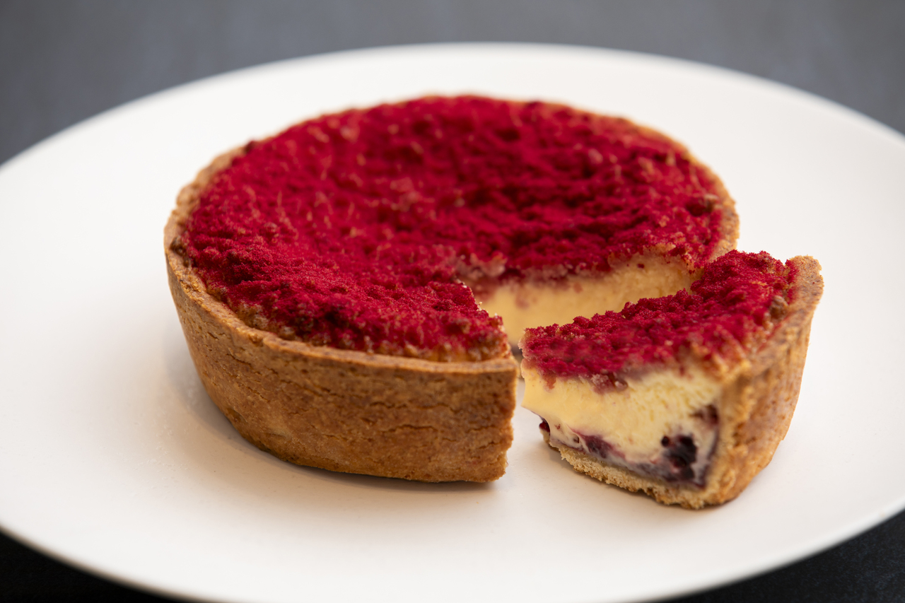A baked yet soft and melt-in-your-mouth cheese base is layered with a crisp cassonade crumble, while the tart crust incorporates Parmesan cheese to accentuate the cheese's aroma.