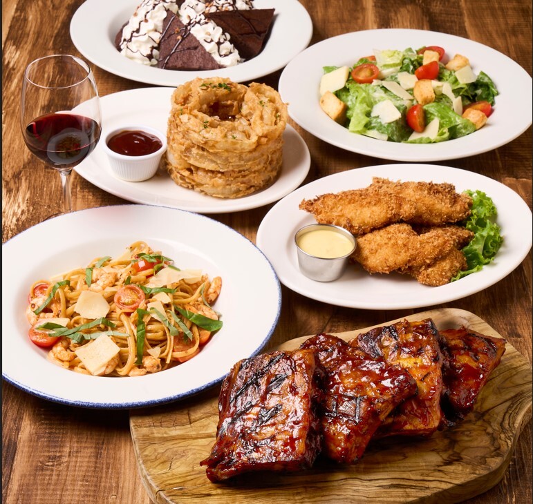 Grilled Shrimp Caesar Salad / Special Onion Loaf / Baby Back Ribs / French Fries / Bread / Homemade Chocolate Brownie / Coffee or Tea