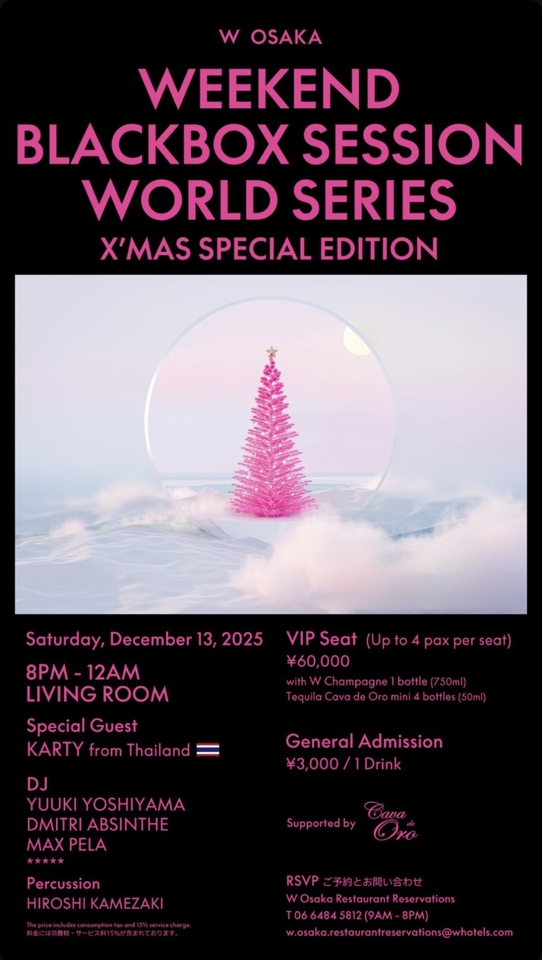 A lineup of four stellar DJs, including special guest KARTY from Bangkok, and percussion by HIROSHI KAMEZAKI will liven up your Christmas night with a dazzling performance.