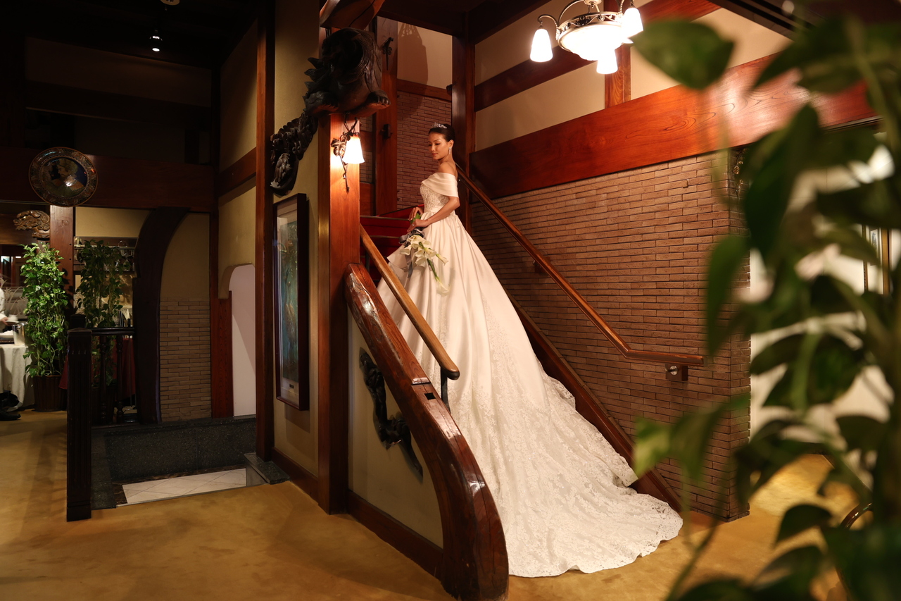 重厚感漂う横浜うかい亭にピッタリのクラシカルな新作ドレスやご新郎の衣装アイテムもご覧いただけます。