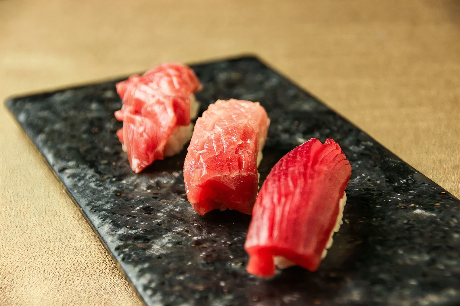 The sushi is prepared by a chef with 37 years of experience in Ginza and Nihonbashi. The chef offers dishes with abalone, shark fin, and bluefin tuna from a long-established wholesaler at an outstanding value, such as "Steamed Abalone with Sake Liver Sauce," "Shark Fin Nigiri with Caviar," and "Toro Takumaki," a bold dish with the outside boldly wrapped in fatty tuna.