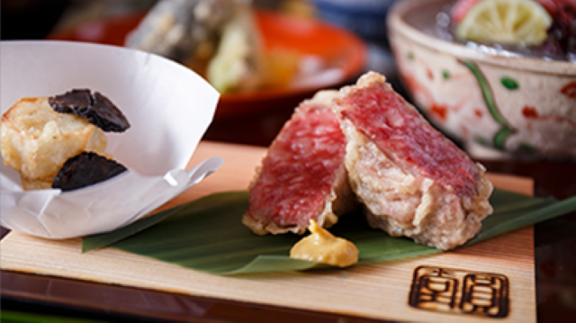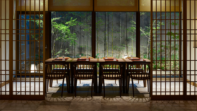 京都五山の一つ、建仁寺が位置する東山区。八坂圓堂 THE CELESTINE KYOTO GIONは、歴史情緒の漂う街のホテルの中にある料理店です。京格子で仕切った客席、壁一面の窓から見える青竹林、書院造のような床の間。店内には、現代と伝統が見事に調和した空間が広がります。厳選した旬の食材を職人の卓越した技術で調理し、独自の感性で仕上げたメニューが人気です。お茶屋としての伝統を引き継いだ格式高いおもてなしと、ここでしか味わえないこだわりの日本料理をお楽しみください。