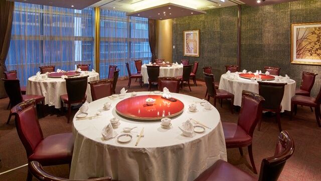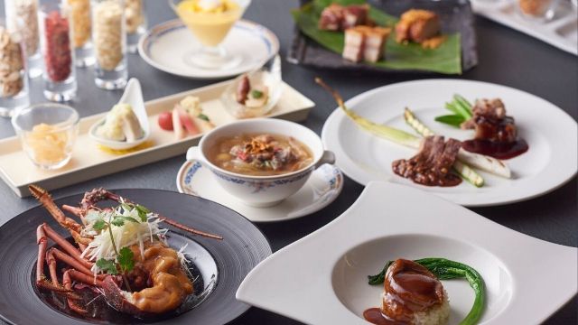 ・Assorted cold appetizer ・Shark's fin and crab meat soup ・Roasted duck skin, Peking style ・Sauteed beef with black pepper ・Braised shrimp in chili sauce ・Fried rice with salmon ・Cantonese Almond Jelly ・Chinese pastry