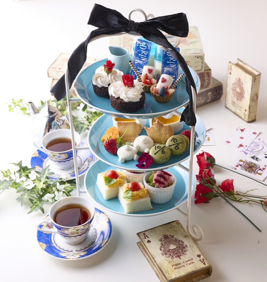 幻想の国のアリス特製アフタヌーンティー『なんでもない日のティーパーティースタンド』不思議の国のアリスに登場するキャラクター達をモチーフにした、自家製のセイボリーやデザートをご用意しております!!なんでもない日をお祝いする、風変わりなお茶会をお楽しみくださいませ♪