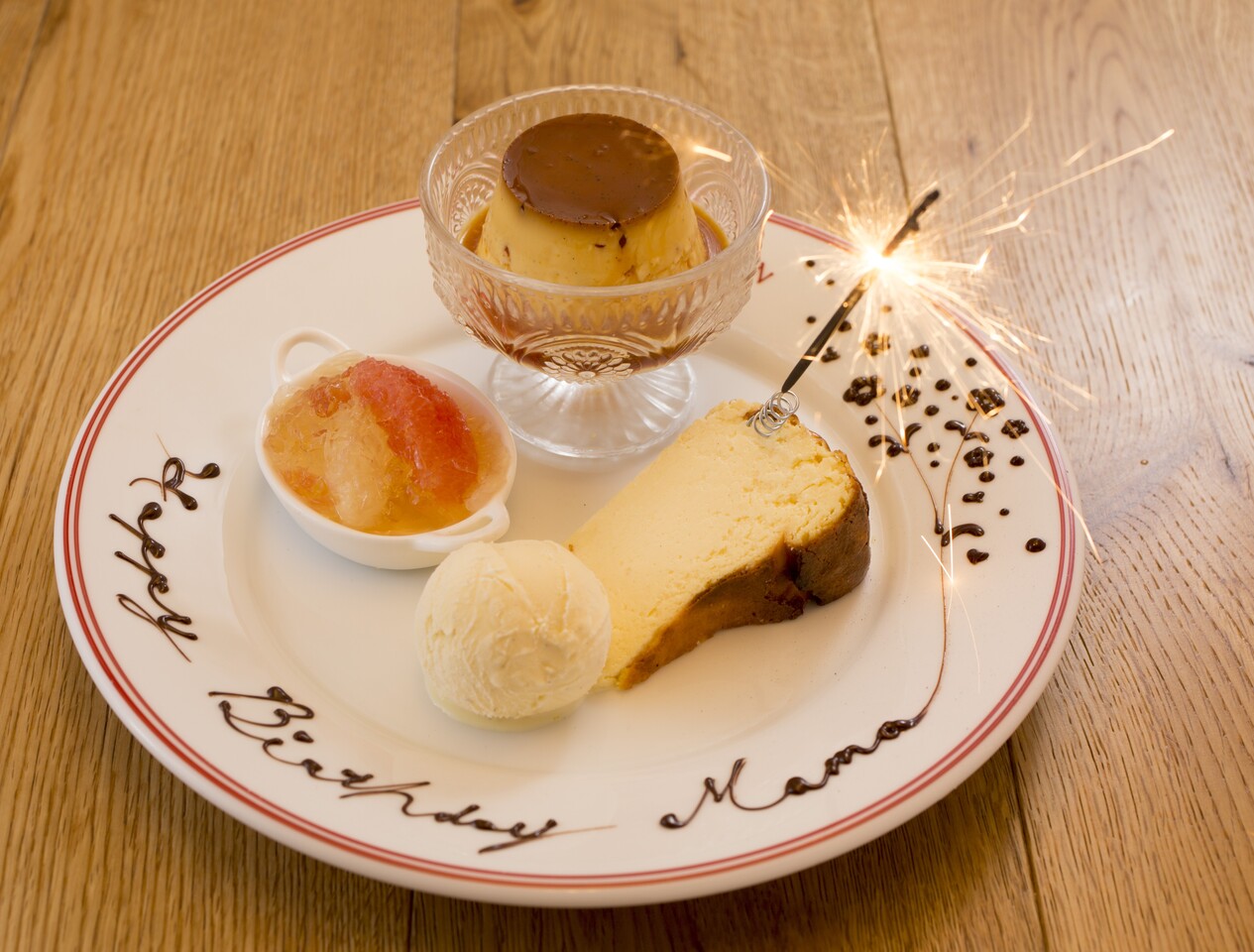 ルパA、ルパCをご注文のお客様は、+1000円でセットについているデザートを「メッセージ付きデザートの盛り合わせ」に変更いただけます。