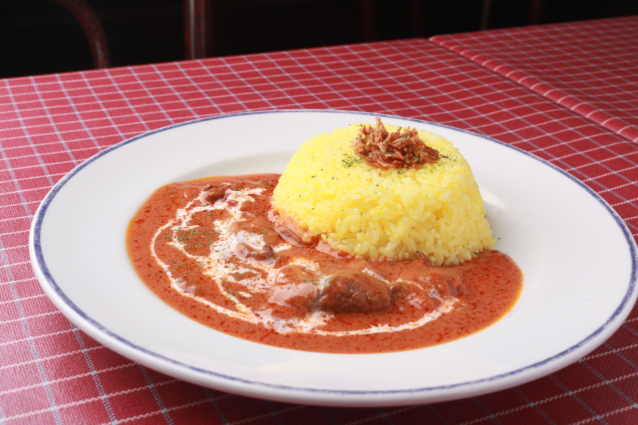 一から作った鶏のブイヨンを使用し旨味がグレードアップ。2時間かけた自家製のストロガノフ。バター香るサフランライスとともにお召し上がりください。