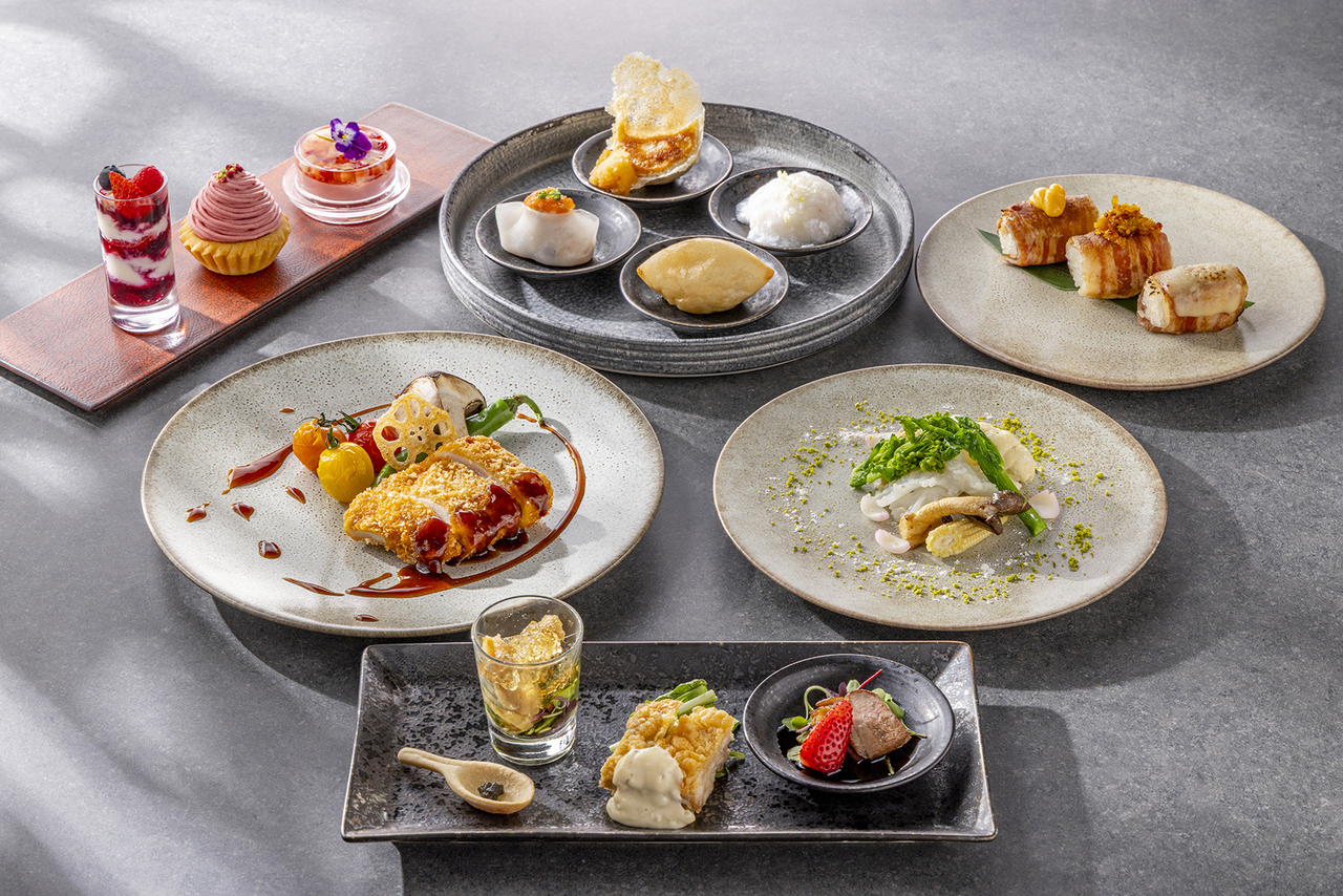 ・Omi duck farce with shiitake mushrooms / Grilled Shinshu Golden Shamo chicken with Karuizawa Atelier Fromage blue cheese / Coffee-flavored roasted Kurobe Meisui pork / Chinese-style burger with Sado beef from Niigata / Blowfish escabeche with Dogo lemon jelly / Apple jelly with “Ringo Bijin” from Shinshu Tateshina Farm