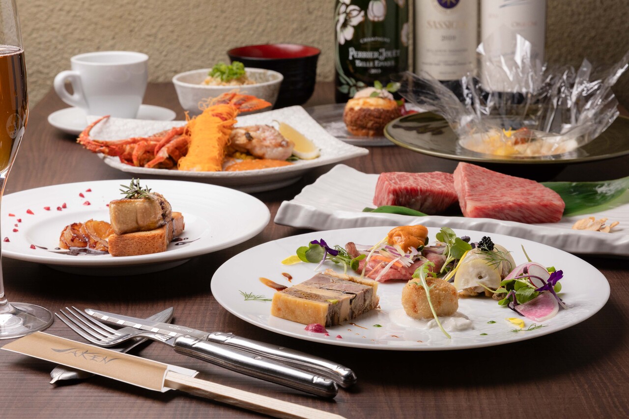 【MENU】 Christmas hors d'oeuvre ~ red and green dichroic sauce ~ ~ marinated champagne julé of Hiroshima oyster and caviar, served with foie gras terrine and root celery mousse snow crab and salmon tartar tomato falci, holo holo chicken putty campagne ~ Special sweet salad of Japanese wagy Tataki Assorted vegetables with soft shell shrimp and gratin of red sea bream French foie gras and raw ham Kaedai winding ~ Hiroshima lemon-flavored balsamico sauce ~ Special black rose wagyu beef loam & peach steak ~ red wine sauce ~ JAKEN original garlic rice (With red juice) Christmas dessert ~ Roll cake of strawberries and green tea, Gelato of coffee