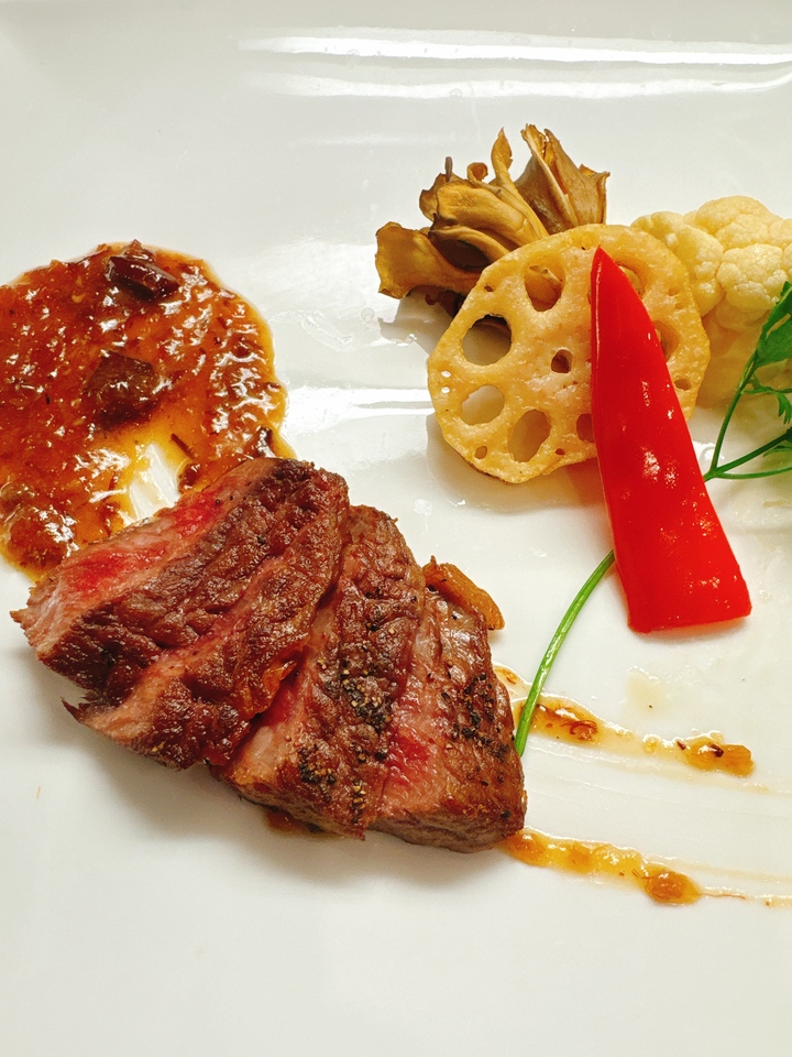 ■ Grilled A5-grade Japanese Wagyu sirloin with champignon (mushroom) sauce