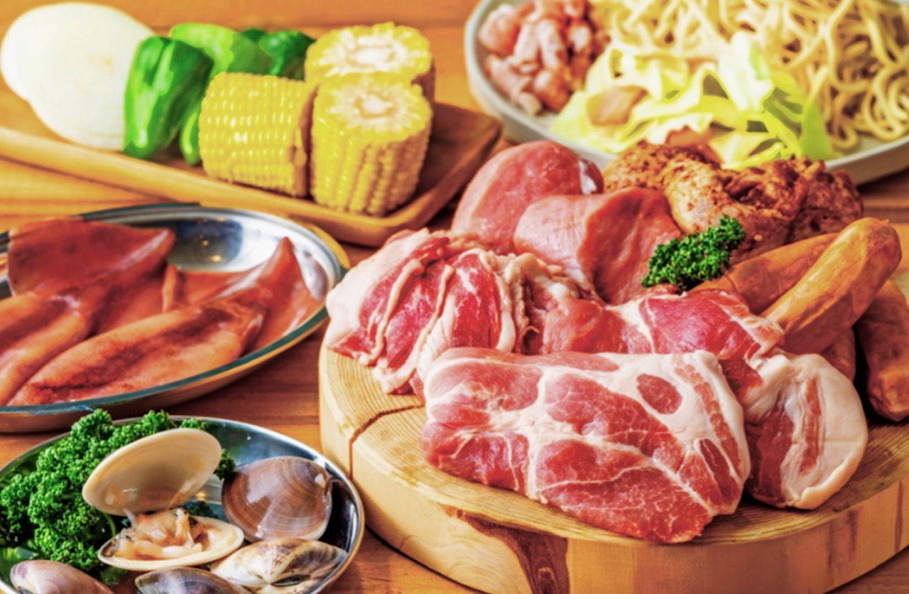 食材と器材一式(椅子、テーブル含む)、炭、トング、食器などの備品もコミコミ!