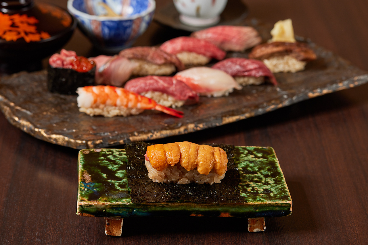 <Private room guaranteed> 10 pieces of assorted beef sushi made with sea urchin and wagyu beef hand rolls, seasonal seafood, and high-quality wagyu beef.