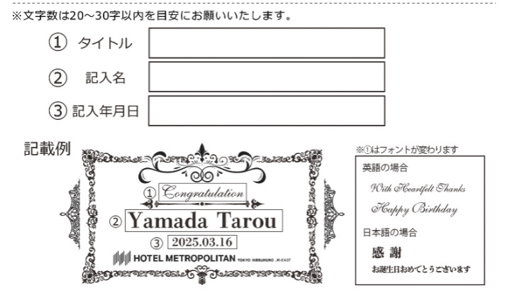 【エチケット部分に入れる文言をご入力ください(例:①Congratulation ②Yamada Tarou ③2025年10月1日】