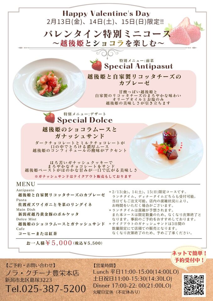 【※2月13日(金)、14日(土)、15日(日)限定‼】バレンタイン特別ミニコース~越後姫とショコラを楽しむ~