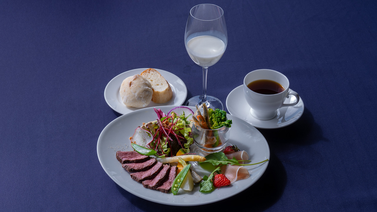 メインディッシュは、香ばしくグリルした但馬牛ロースに、瑞々しい春野菜を添えて。肉の旨みと野菜の爽やかさが調和する一皿です。パンとコーヒーが、コースの余韻を穏やかに締めくくります。