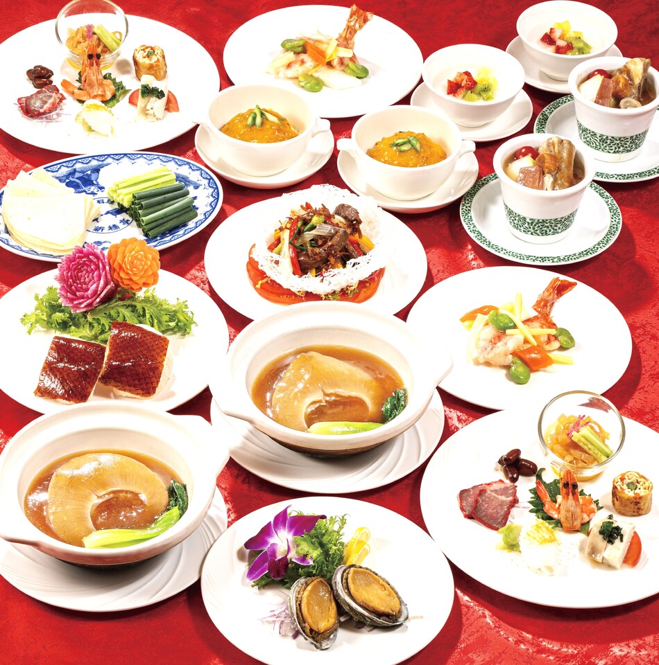 前菜四種盛り/フカヒレコラーゲンと野菜のスープ仕立て/揚げ海老と旬野菜の甘辛炒め/シェフのおすすめ鶏料理/新橋亭伝統の豚肉角煮/青菜とトックの塩炒め/黄ニラと各種野菜の香港焼きそば/杏仁豆腐