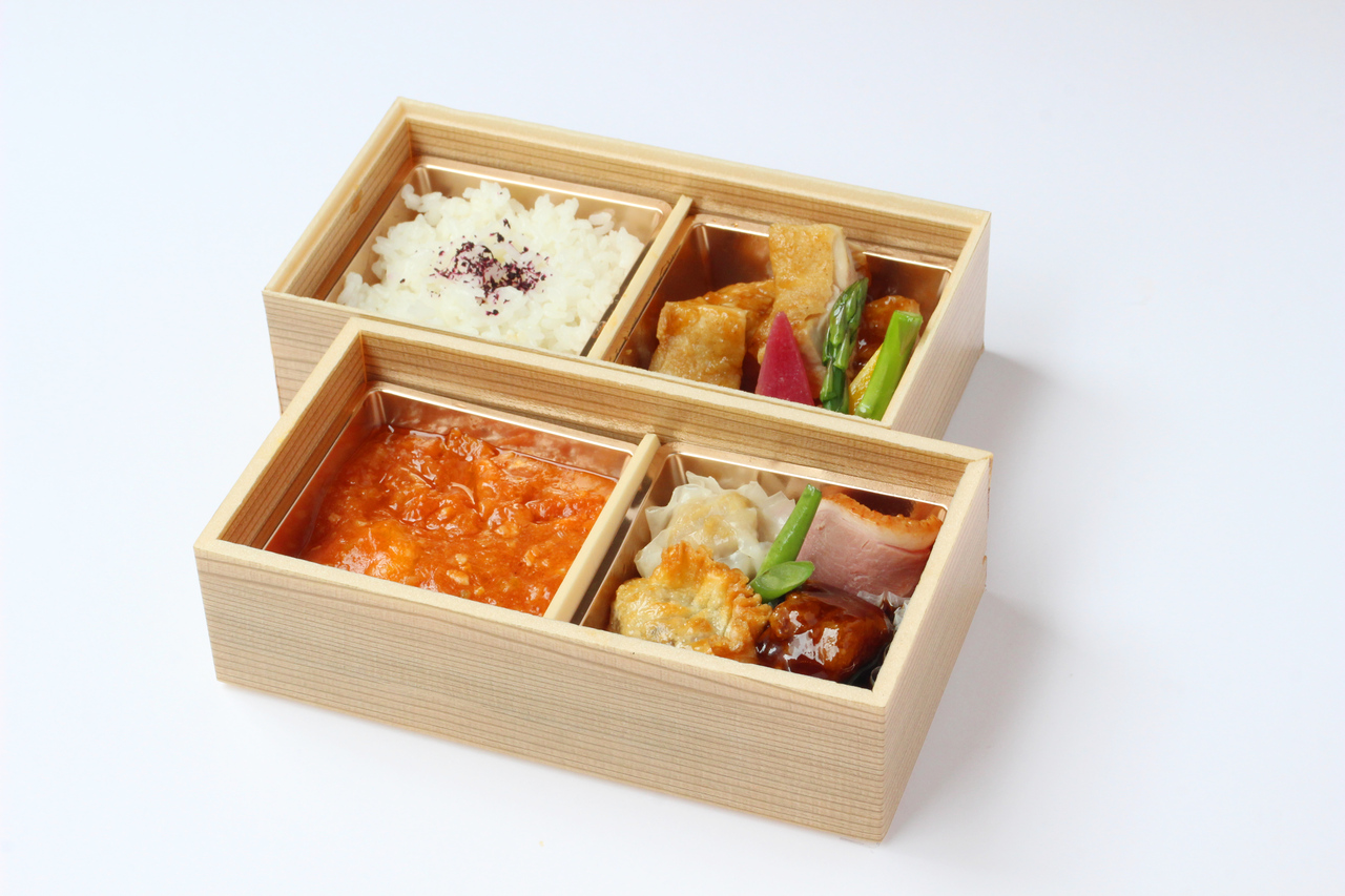 【お弁当内容】小海老のチリソース煮 ・ 鶏肉のオーブン焼き~四川香料ソース仕立て~ ・ 前菜 ・ 黒酢酢豚 ・ 焼売 ・ フカヒレ餃子 ・ 五目炒飯