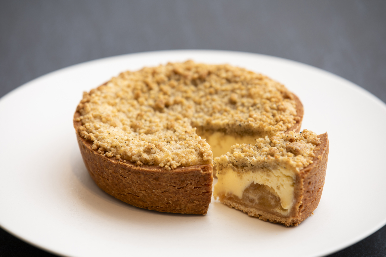 A tart featuring a soft, melt-in-your-mouth cheese base layered with fragrant Earl Grey crumble and sautéed apples. The rich creaminess of the cheese, the sweet-tart flavor of the apples, and the aroma of black tea fill your mouth with every bite.