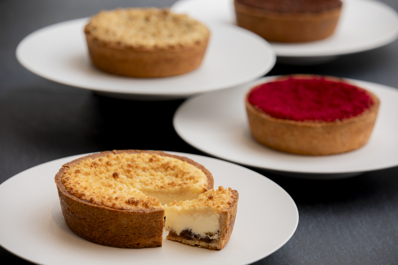 A baked yet soft and melt-in-your-mouth cheese base is layered with a crisp cassonade crumble, while the tart crust incorporates Parmesan cheese to accentuate the cheese's aroma.