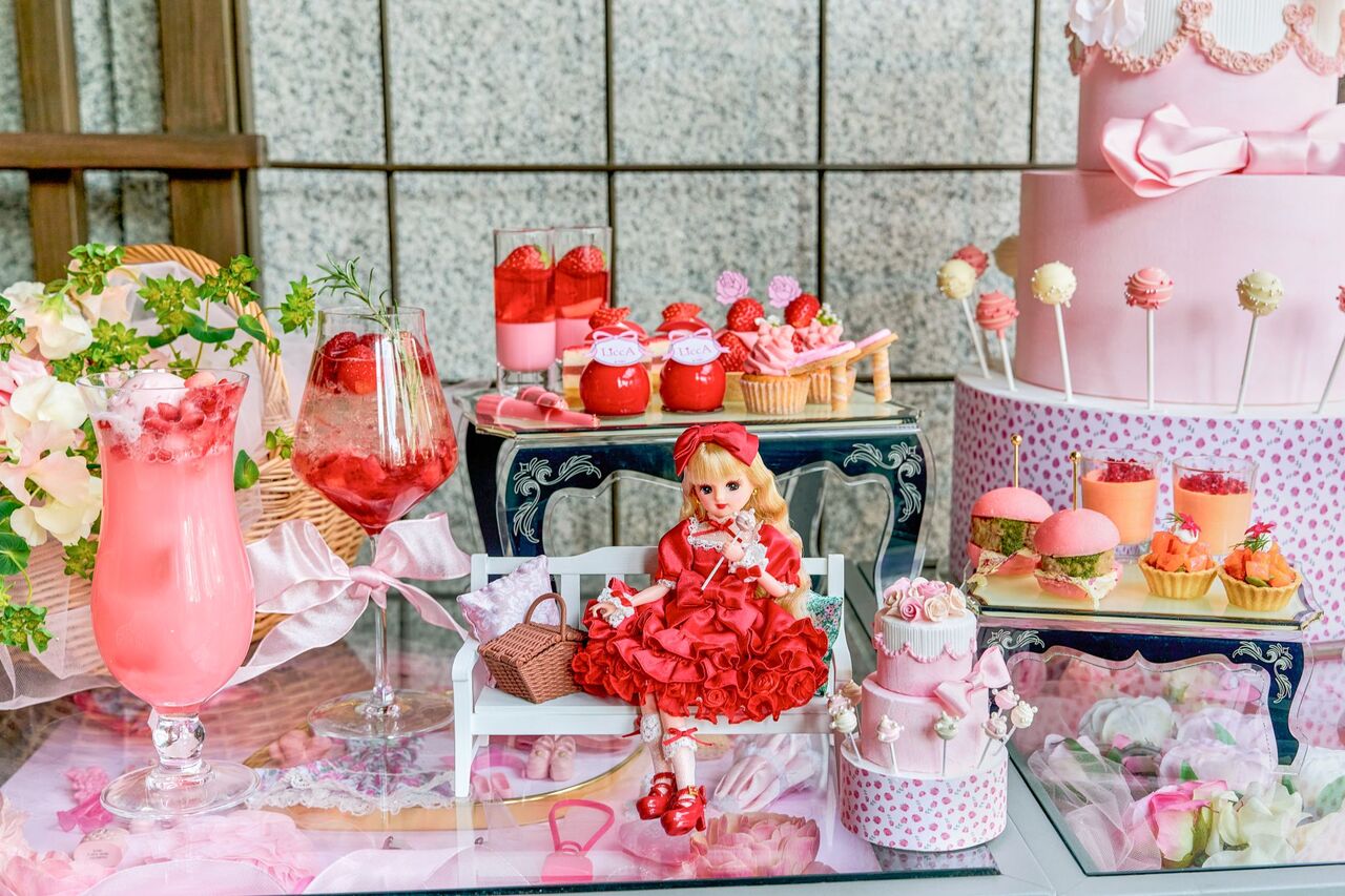 テラス席は、コラボレーション期間限定のスペシャルデコレーションでお届け。ピンク色のジャンボフラワーが華やかなソファ席や、リカちゃんのドレスやアクセサリーをガラスのボックスに散りばめたテーブルなど、リカちゃんらしいガーリーな装飾が彩り、ロマンティックなティータイムをお過ごしいただけます。