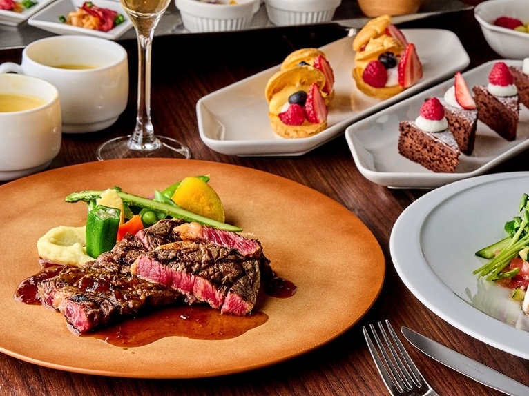オードブルブッフェ / 季節のスープ / パスタ / 魚料理 / 肉料理 黒毛和牛フィレ肉のグリル / パンまたはライス / 季節のフルーツタルト / コーヒー OR 紅茶
