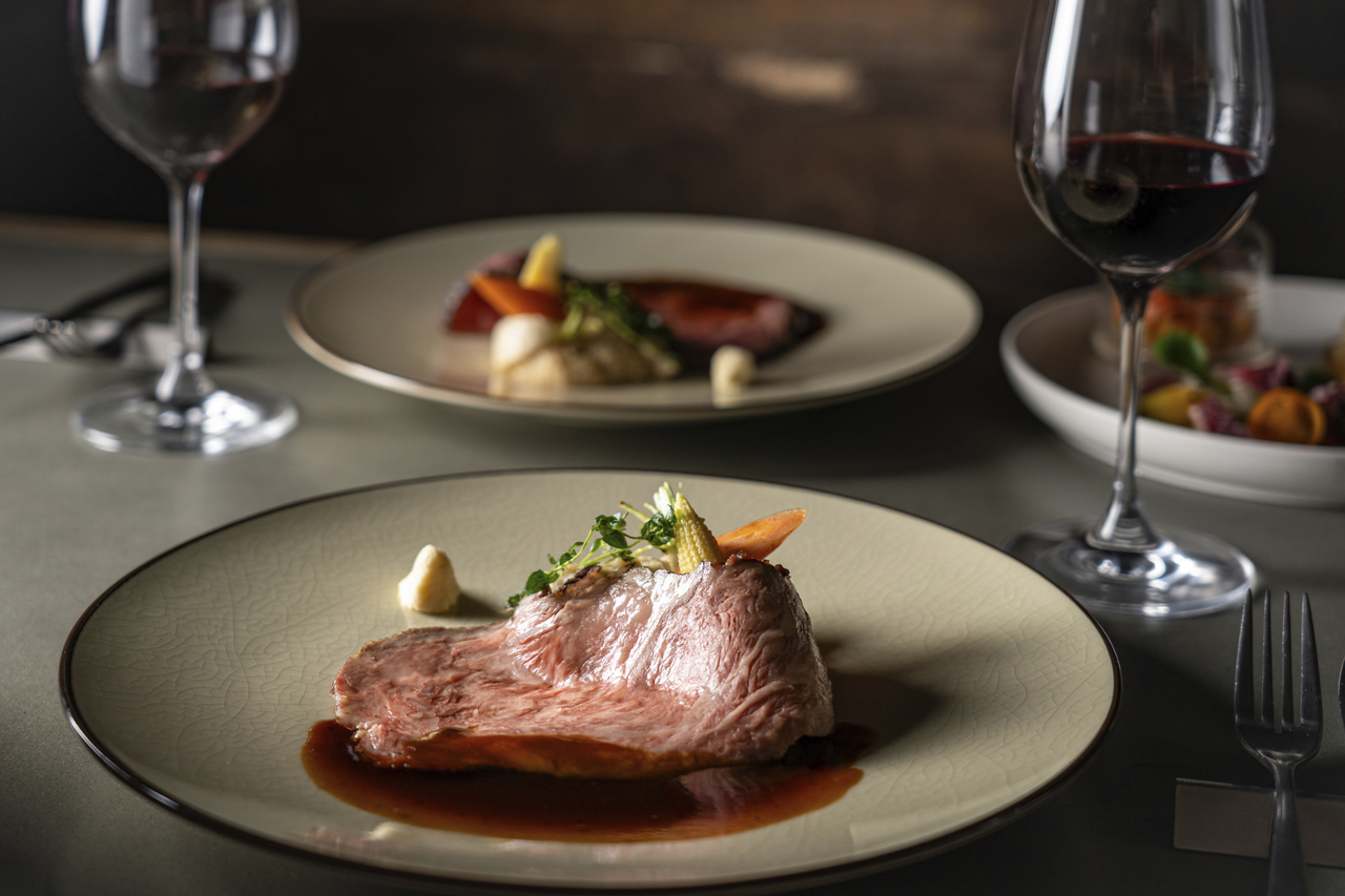 オリジナルカクテルとともに味わう季節のアペリティフから、サーモンのカルパッチョやホタルイカと筍のクリームリゾットなど、季節を感じる彩り豊かな料理に、メインの国産サーロインの瞬間燻製グリル