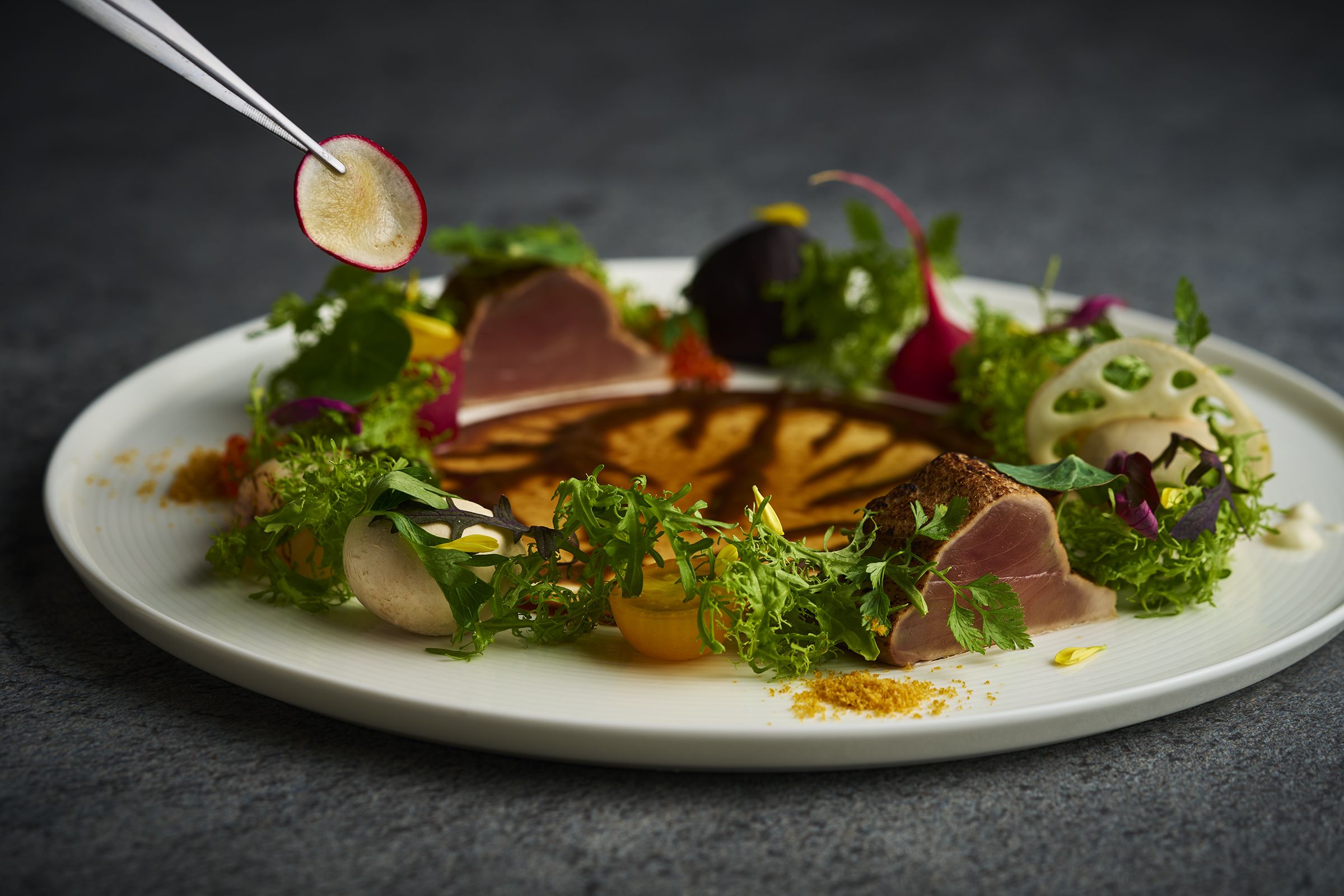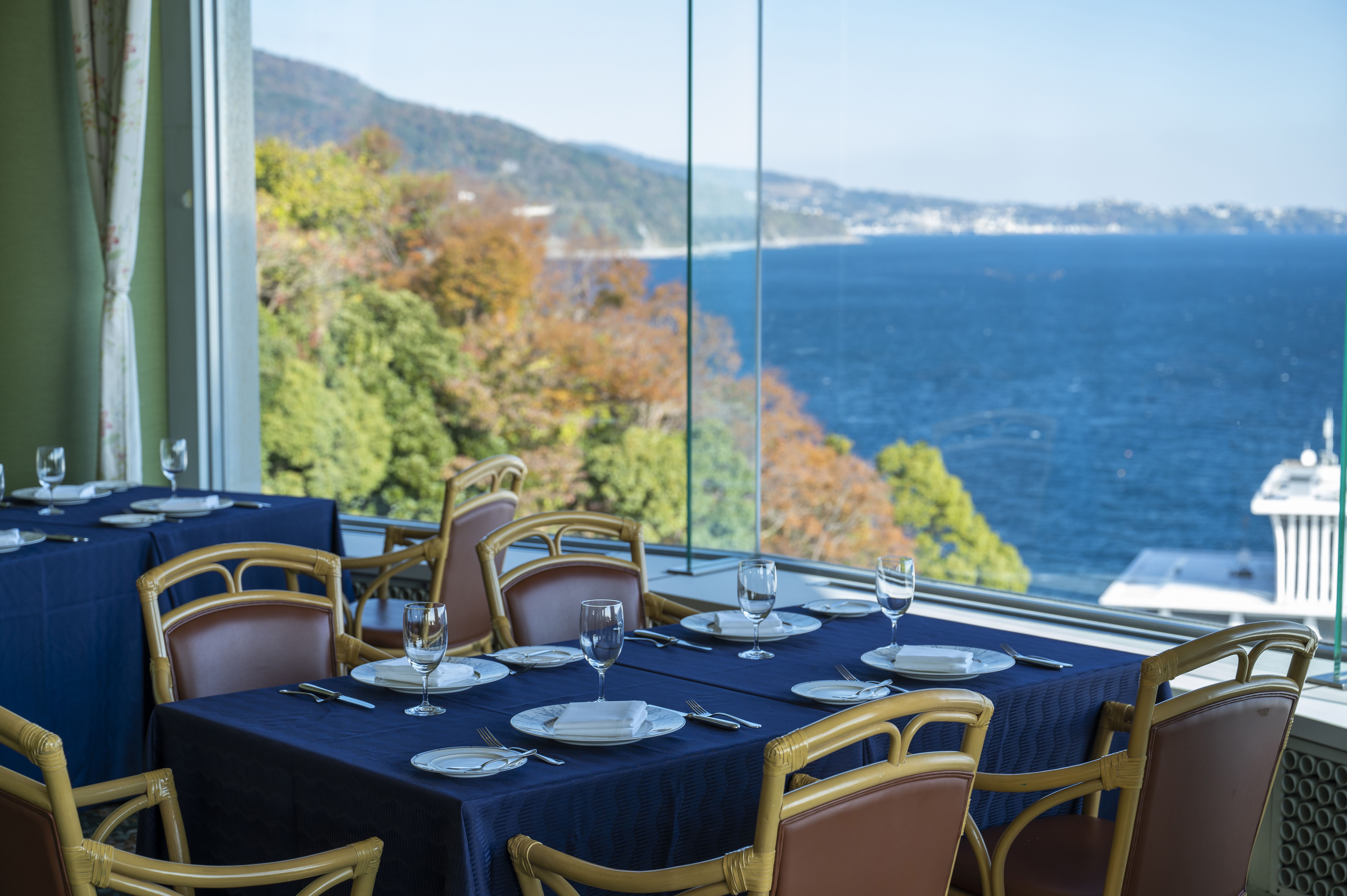 店内に入ると、ガラス張りの開放的な空間が広がります。ガラス越しのきれいな海を眺めながら、ゆったりした食事の時間をお楽しみください。地元の旬の食材を使用し、素材に拘って丁寧に作り上げた料理の数々。カジュアルでありつつ、モダンな盛り付けを意識したフレンチをご堪能いただけます。料理に合わせて、様々な種類のワインも提供しています。