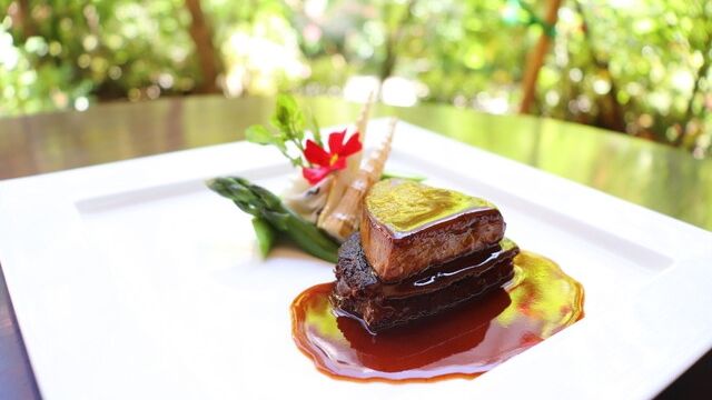 庭園を眺めながら、地元の食材を使った料理を味わう本格フレンチ