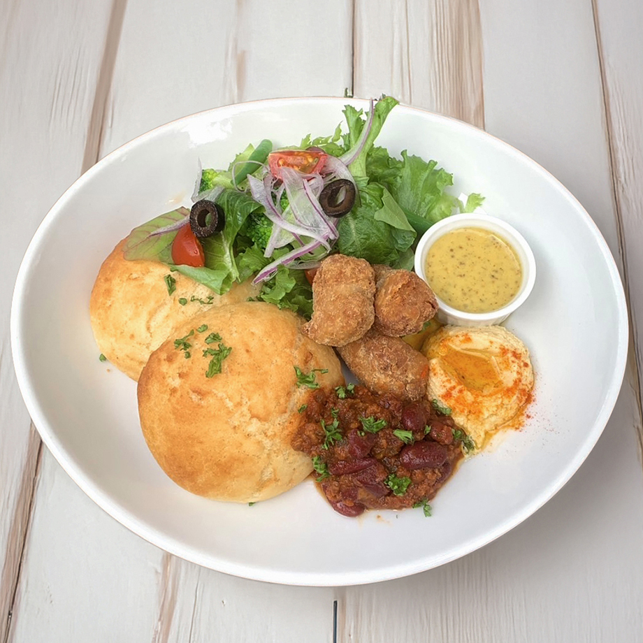 เป็นมิตรกับมังสวิรัติแบบตะวันออก คัตเล็ตที่ได้รับความนิยมอย่างมากทำจากเนื้อถั่วเหลืองและมีปริมาณอิ่มมาก! อิ่มอร่อยกับสลัดผักออร์แกนิคและข้าวกล้องปลอดสารพิษ