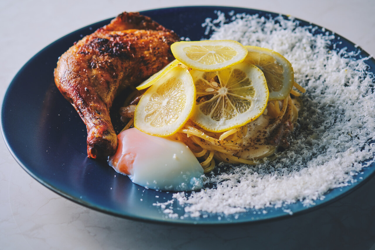 「Lemon cheese sauce pasta with charcoal grilled chicken and half boiled egg」
