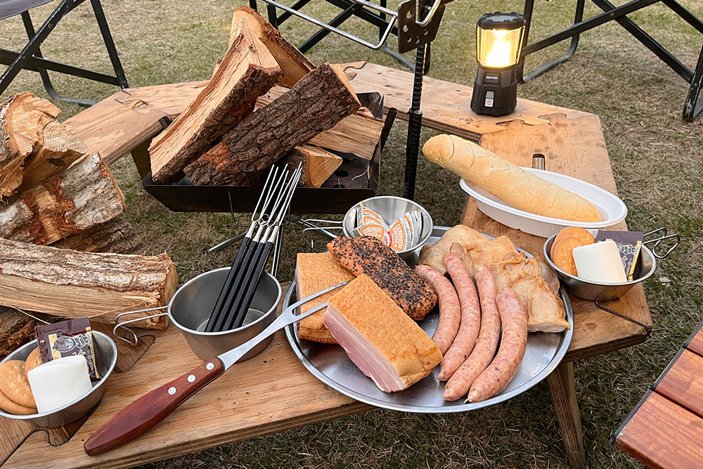 Beef shoulder steak (imported, 150g) Pork loin slices (imported, 50g x 2 slices) Smoked leg (150g) Frankfurter (1 piece) S'mores with 3 kinds of cut vegetables (1 marshmallow, 1 chocolate, 2 crackers) Condiments (salt, pepper, oil, BBQ sauce) *The photo shows a 4-portion serving.